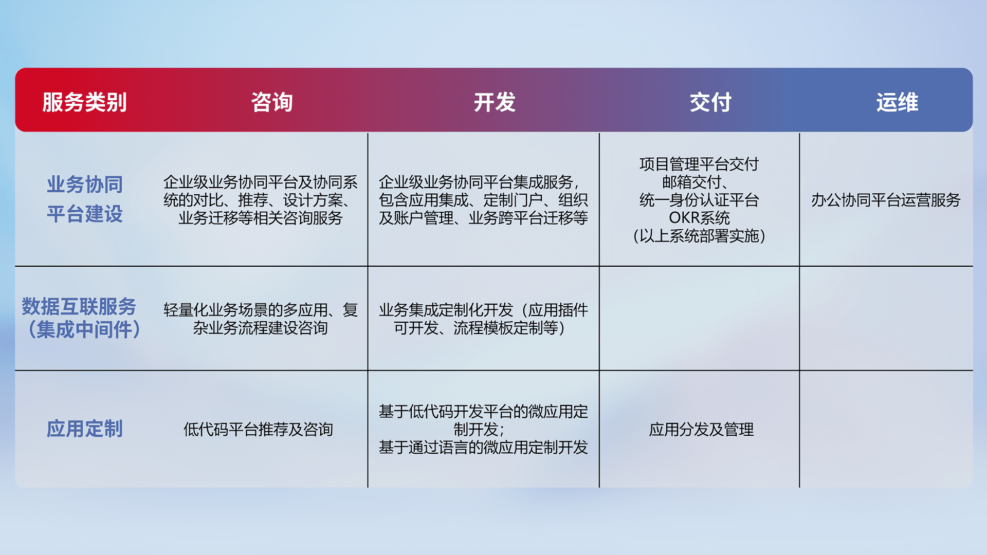 针对钉钉、、企微、、IDaas等平台级产品提供产品的规划、、、、方案、、、、交付、、、、定制化开发等服务,,,实现如统一协同办公、、、智能客户服务、、、混合会议管理、、智能数据查询、、等业务场景,,实现数字化转型。。